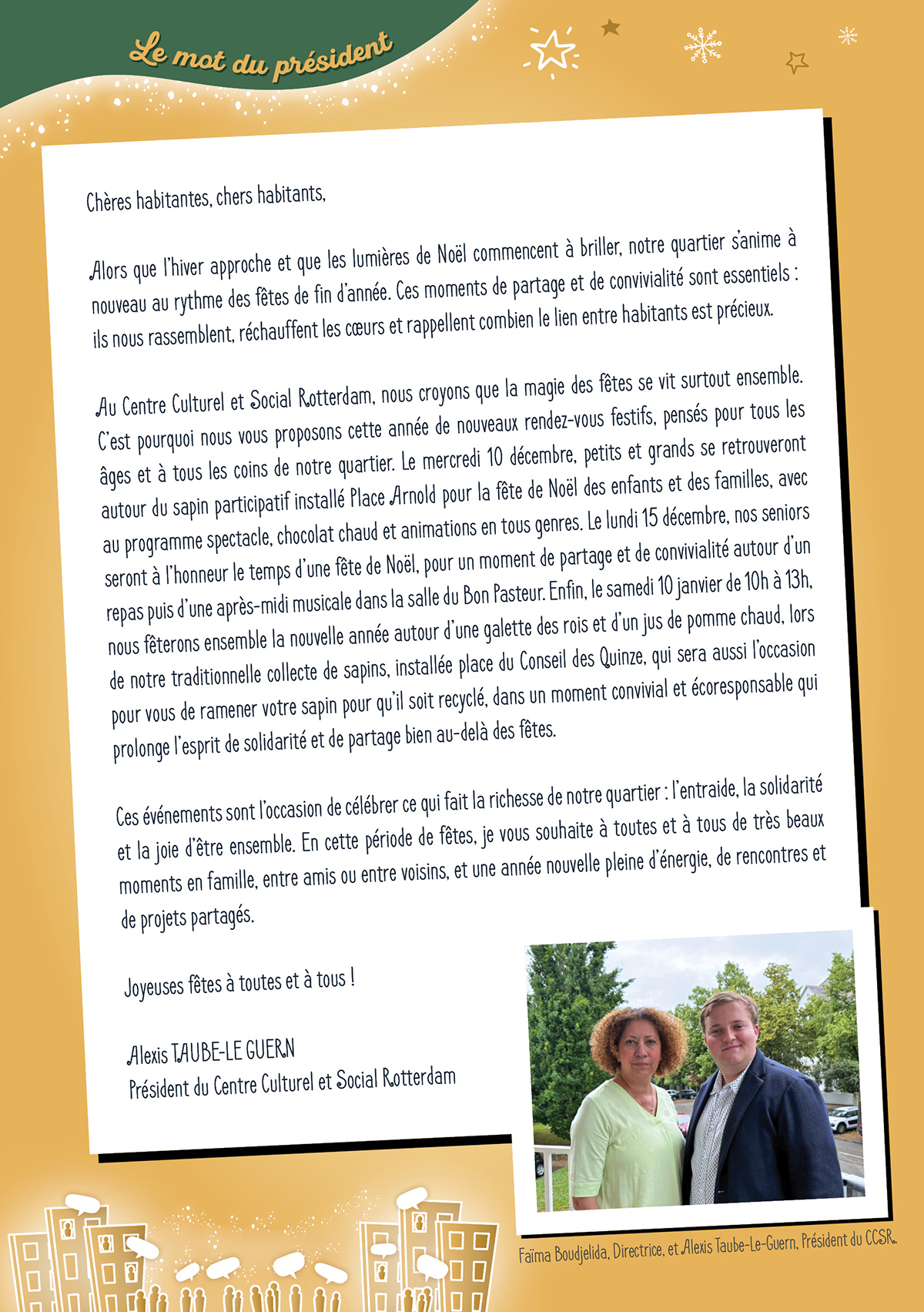 Le Centre Culturel & social Rotterdam est une association à but non lucratif. Elle est gérée par un Conseil d’Administration composé d’adhérents élus lors de l’assemblée Générale annuelle ainsi que des représentants de la Ville de Strasbourg et du Conseil Général.