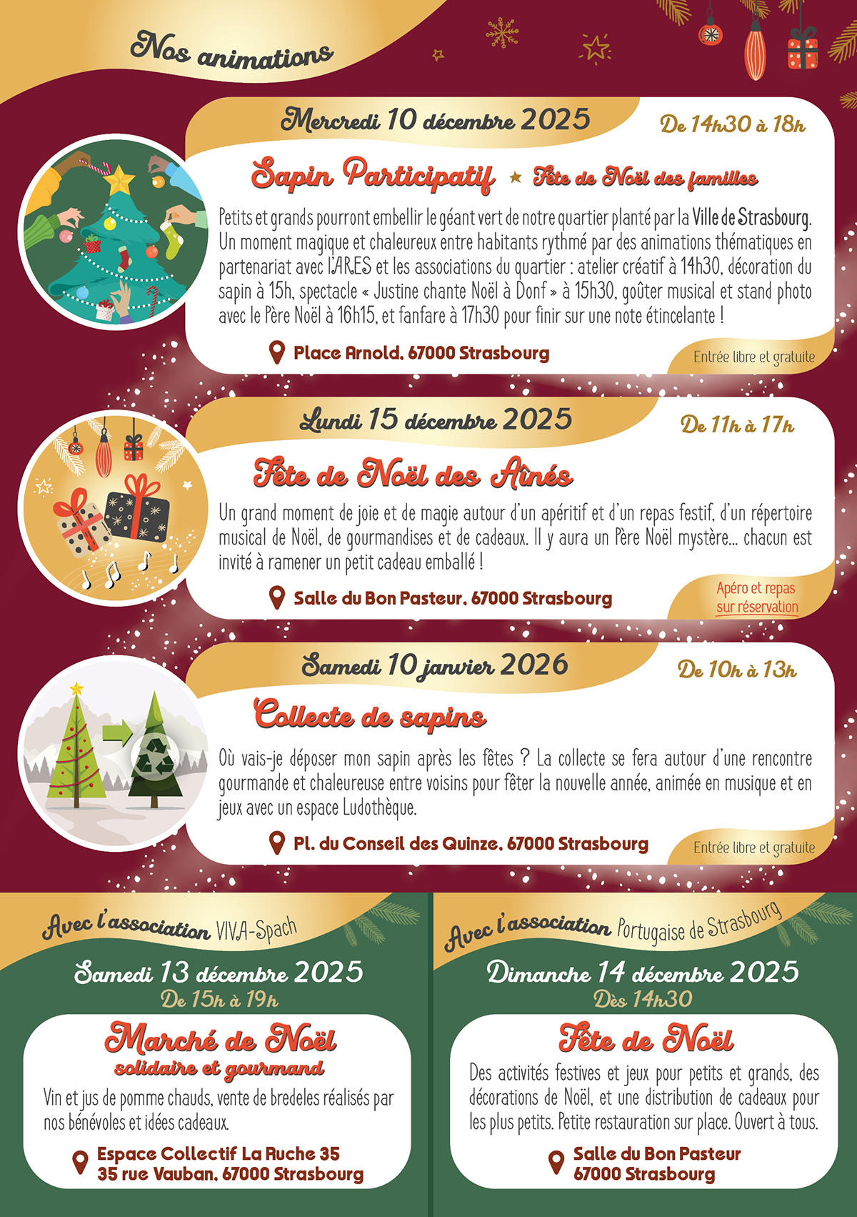 Votre quartier s’illumine durant les fêtes de fin d’année autour d’animations chaleureuses et de plaisir partagé : sapin de Noël participatif, fête de Noël des aînés, collecte de sapins… célébrons ensemble ces moments de joie et de magie !