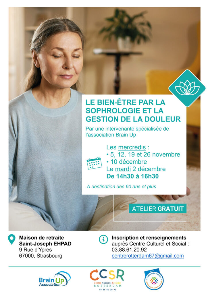 C’est dans cette optique que le Centre Culturel et Social Rotterdam (Strasbourg), en partenariat avec l’association Brain Up, vous propose de participer au programme  » Le bien-être par la sophrologie et la gestion de la douleur » au cours duquel il vous sera proposé de mieux comprendre les mécanismes de la douleur, d’apprendre à poser un regard objectif et bienveillant sur ses propres douleurs mais aussi apprendre à mieux faire face aux situations de stress, à mieux vivre ses émotions, et à valoriser l’estime de soi. Animé par une professionnelle de santé, il s’agit avant tout d’un espace d’échange convivial et positif.