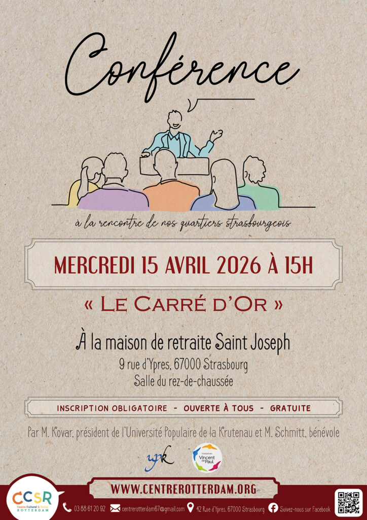 Rejoignez-nous le mercredi 15 avril 2026 à 15h à la Maison de Retraite St Joseph où vous découvrirez ses secrets bien gardés. Que vous soyez un habitant de longue date ou un nouvel arrivant à Strasbourg, cette conférence sera l’occasion parfaite de renforcer vos connaissances sur ce quartier singulier.