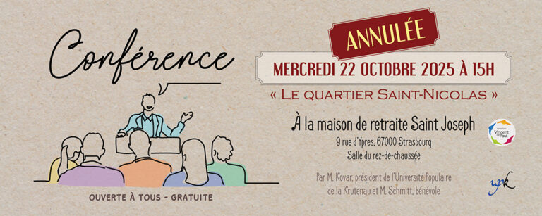 [ ANNULÉE ] Conférence » Le quartier Saint-Nicolas » par l’UPK à Saint Jo’La conférence « Le quartier Saint-Nicolas » aura lieu le mercredi 22 octobre 2025 à St Jo’, animée par le président de l’UPK de Strasbourg 🎤🏙️🔍