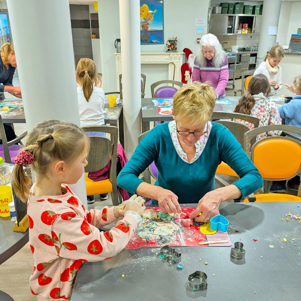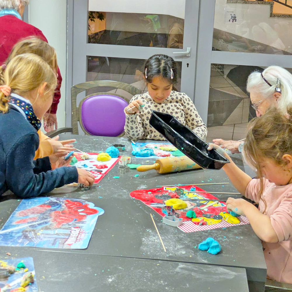 Le mercredi 26 novembre, les enfants de l’Accueil de Loisirs et les résidents de la Maison de Retraite Saint-Joseph se sont retrouvés pour un après-midi créatif : petits et grand on confectionné ensemble des petits sujets en pâte à sel, suivi d’un beau moment de complicité autour de chants et d’un goûter partagé entre générations !