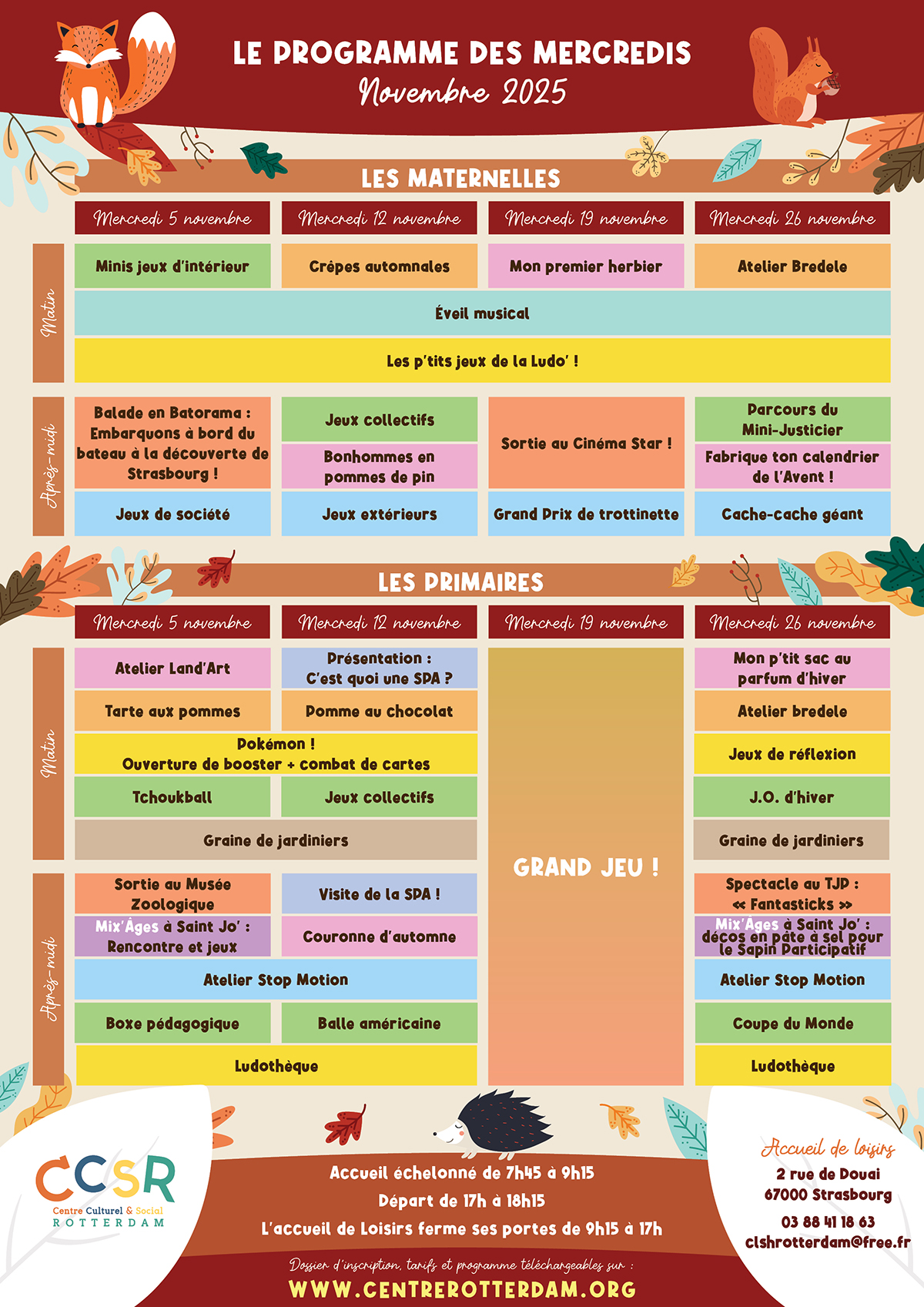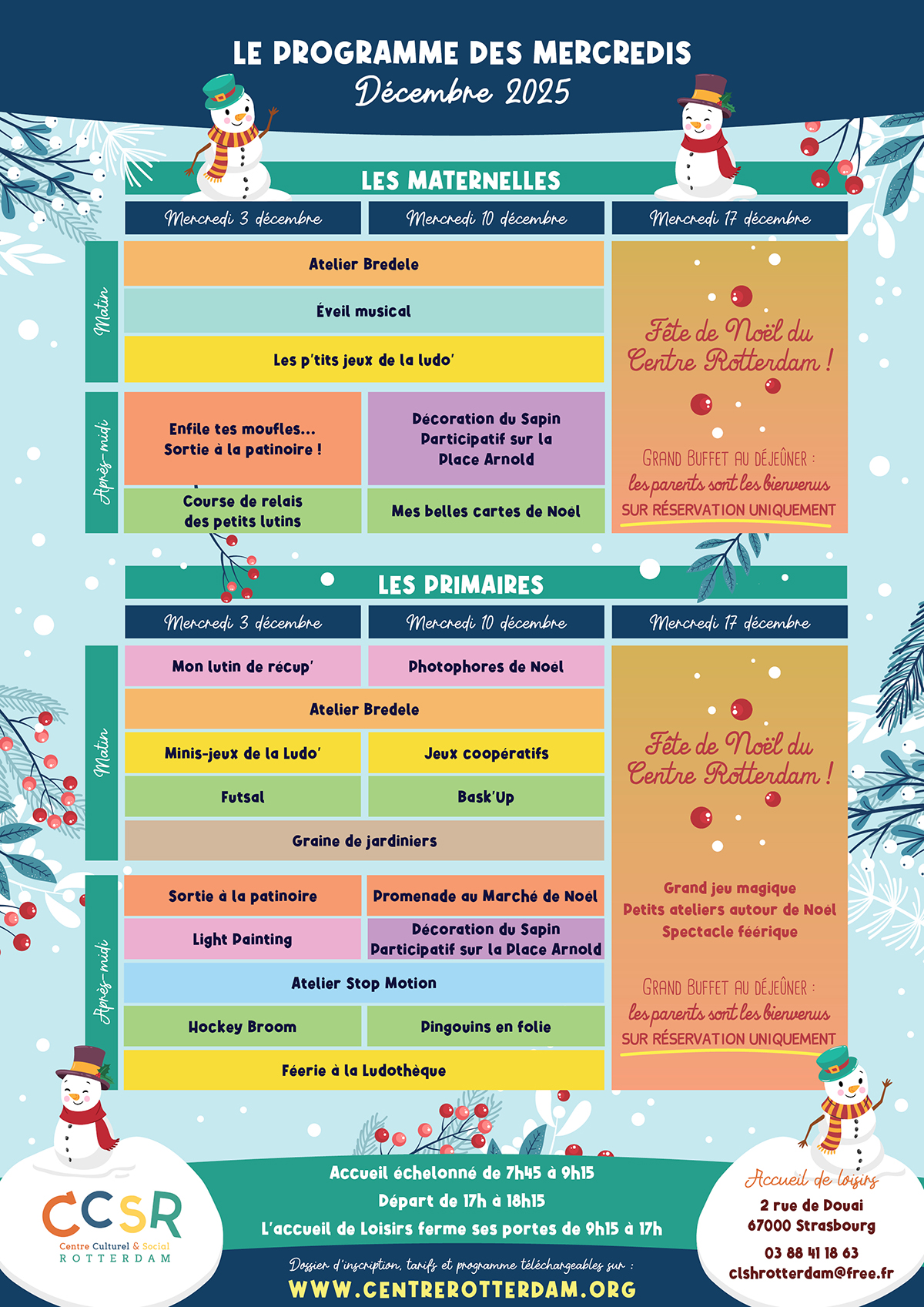 Les rencontres « Mix’Âges » à la maison de retraite Saint Jo’ permettront de partager un moment de plaisir avec les séniors autour d’activités ludiques chaque 1er mercredi du mois ! 🫶 Nous en profiterons aussi pour créer ensemble notre décoration pour le Sapin de Noël participatif, qui aura lieu le 10 décembre sur la Place Arnold. 🎄 Et pour finir l’année les yeux remplis d’étoiles, notre journée magique de Noël se tiendra le mercredi 17 décembre, avec de nombreux ateliers, jeux, et spectacles enchantés… sans oublier notre délicieux buffet de fin d’année ! ✨
