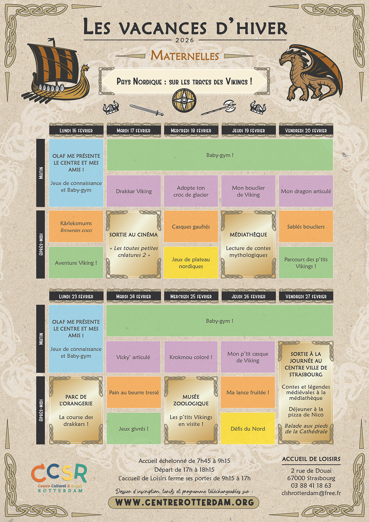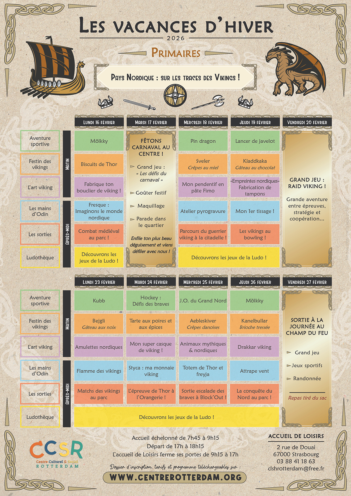 L’accueil de loisirs se transforme en véritable village viking : drakkars, runes mystérieuses et légendes nordiques seront au rendez-vous. Entre aventures glacées et défis de guerriers, découverte de la gastronomie nordique et créations inspirées des Vikings, les enfants partiront sur les traces de ces explorateurs intrépides. Préparez vos casques (en carton) et votre courage : une épopée hivernale inoubliable les attend !