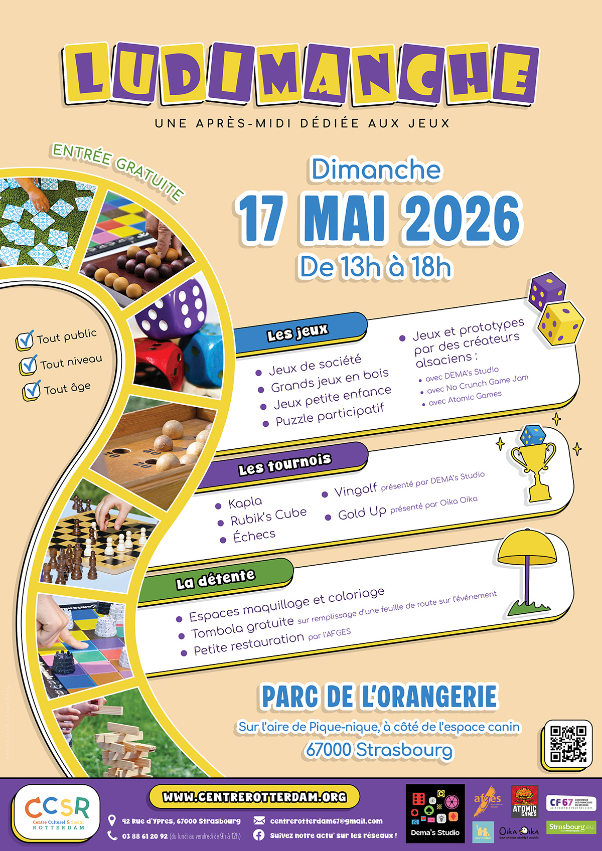 Laissez-vous guider par nos ludothécaires, véritables maîtres du jeu, qui vous accompagneront dans la découverte de notre Ludothèque : jeux de société modernes et classiques, grands jeux en bois et espaces dédiés à la petite enfance. Un puzzle participatif inédit aux couleurs du Centre Rotterdam invitera chacun à poser sa pièce pour construire une œuvre collective. Nos partenaires alsaciens, DEMA’s Studio, No Crunch Game Jam et Atomic Games, créateurs de jeux et de prototypes, vous immergerons dans leurs univers ludiques et originaux. Il y en aura pour tous les goûts, tous les âges, et tous les niveaux, du joueur occasionnel au stratège confirmé.
