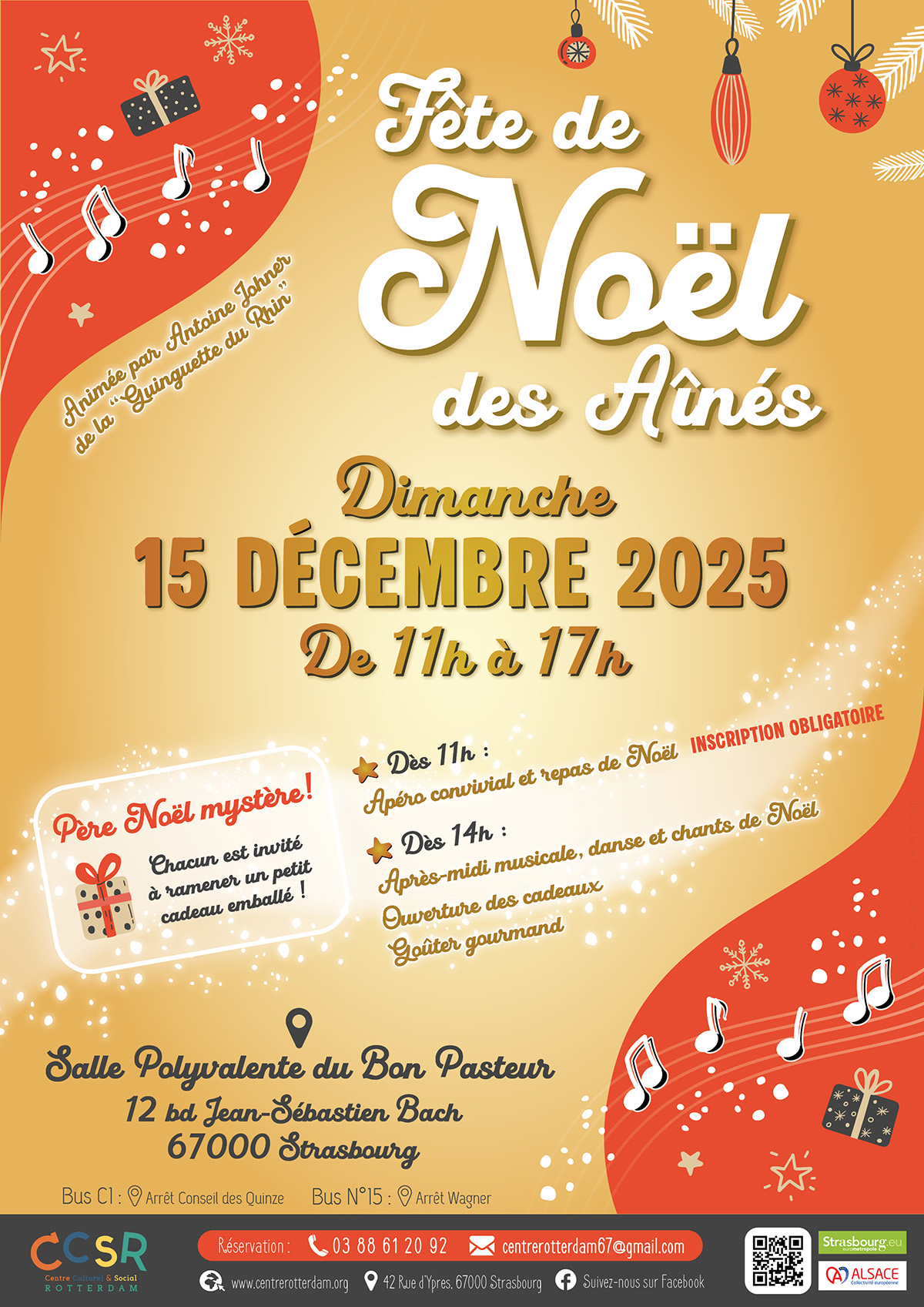 La journée débutera par un apéritif convivial dès 11h pour se retrouver et échanger dans la bonne humeur, avant de savourer un délicieux repas de Noël (apéro et repas sur inscription). 🍴 À partir de 14h, les festivités se poursuivront dans une ambiance musicale autour d’un répertoire de chants de Noël, animée par Antoine Johner de la Guinguette du Rhin, qui saura faire danser, chanter et sourire tous les participants ! 🎶 Puis viendra le temps tant attendu de l’ouverture des cadeaux, avant de conclure cette belle journée autour d’un goûter gourmand, plein de saveurs et de convivialité. 🍰