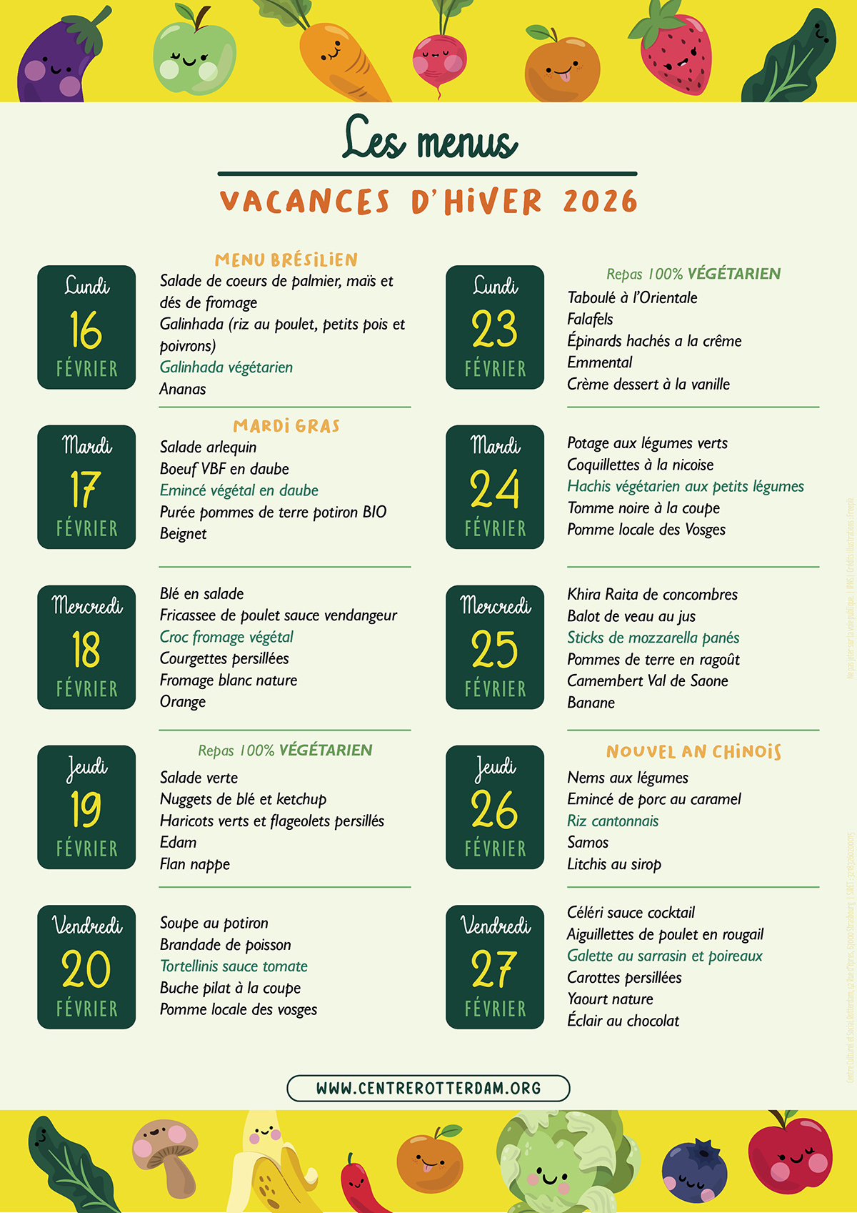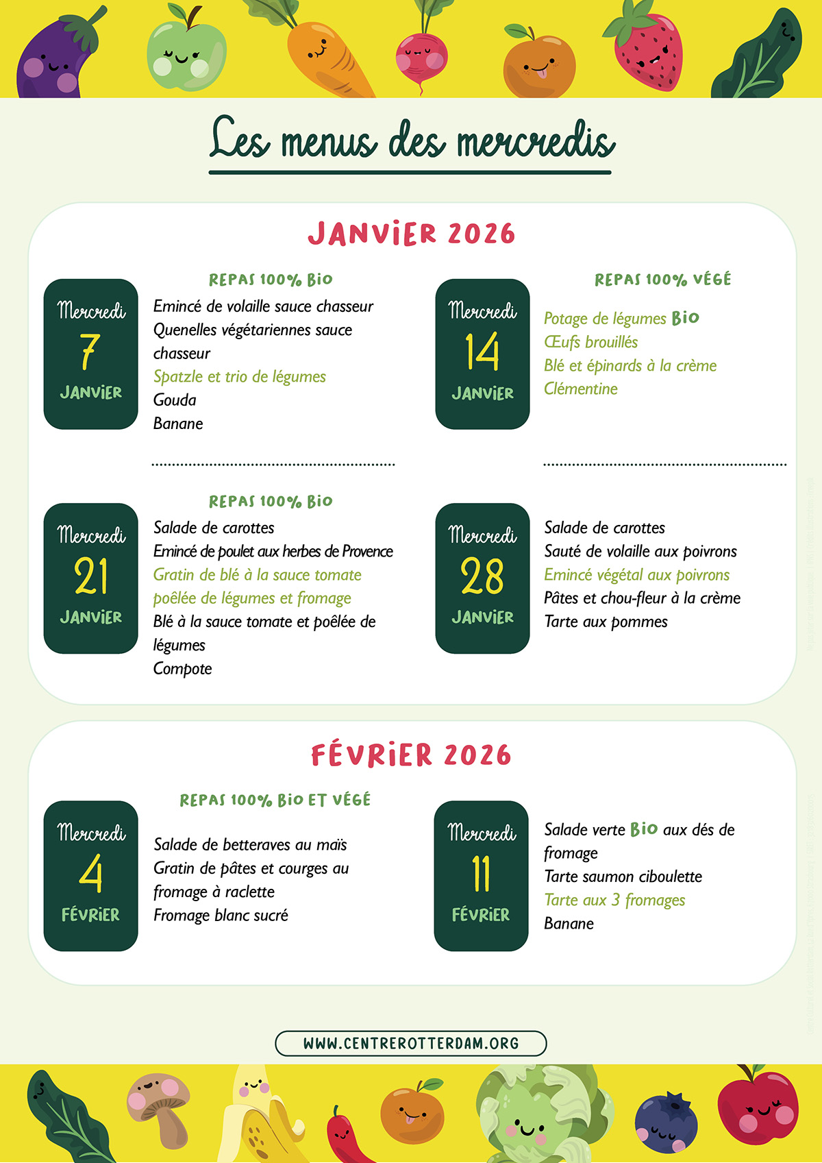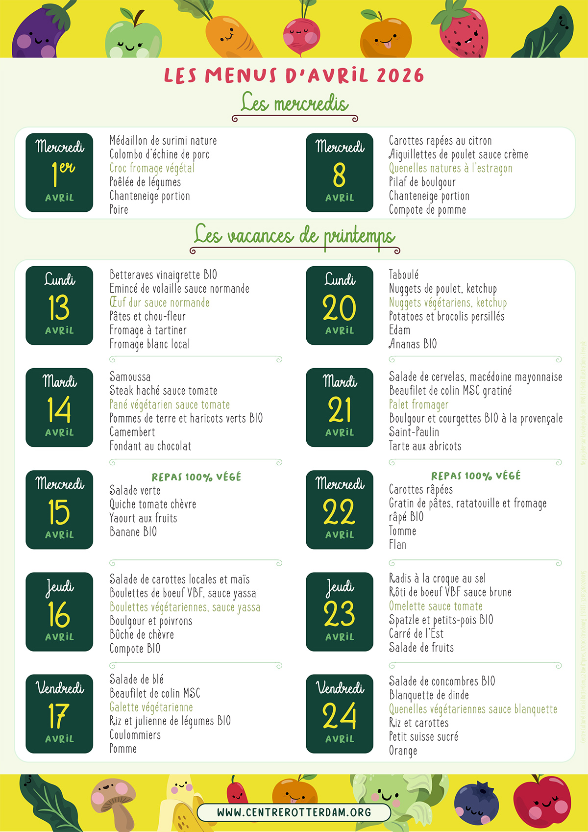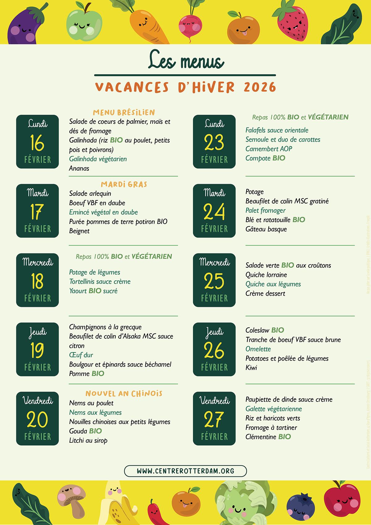 Pour vos enfants accueillis les mercredis et les vacances scolaires à l’école du Conseil des XV, vous pouvez consulter les menus proposés les midis à l’Accueil de Loisirs. Ces menus sont composés en accord avec une nutritionniste professionnelle et un traiteur choisi par le Centre Rotterdam. La qualité et l’équilibre sont bien entendu les critères numéro 1. Des repas végétariens et sans porc sont toujours proposés comme alternative aux menus standards. De plus, plusieurs fois par mois, notre traiteur propose des repas entièrement ou partiellement BIO.