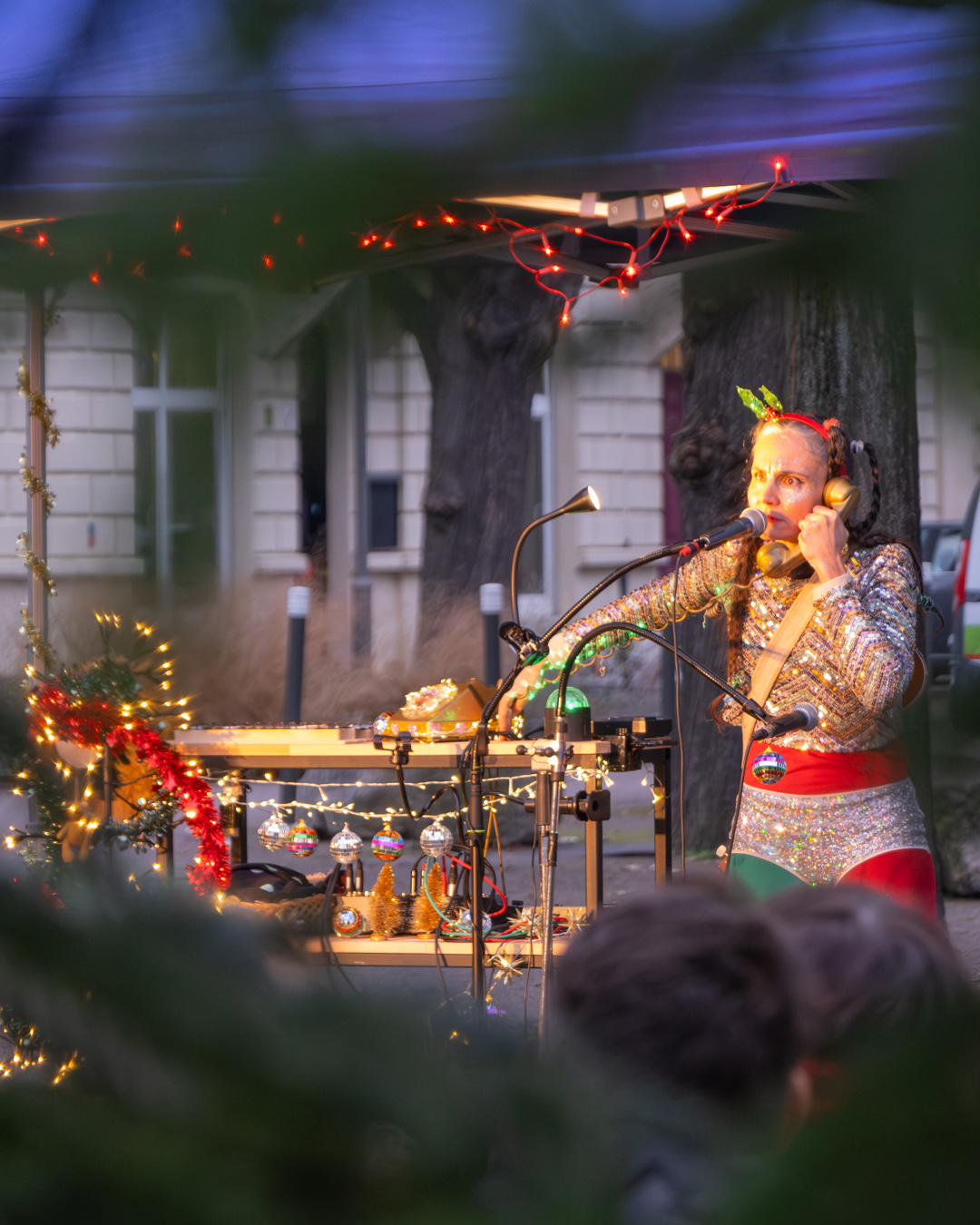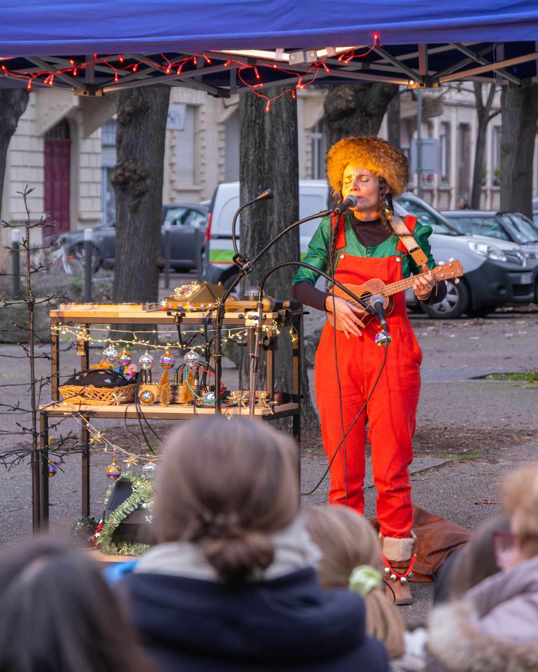 Les festivités ont débuté en douceur avec un atelier créatif animé par l’ARES, bercé par les chants polyphoniques géorgiens. La compagnie Bas les Pat a ensuite électrisé la place avec son spectacle « Justine chante Noël à Donf », réchauffant le public avant le grand moment de décoration du géant vert, auquel petits et grands ont joyeusement participé.
