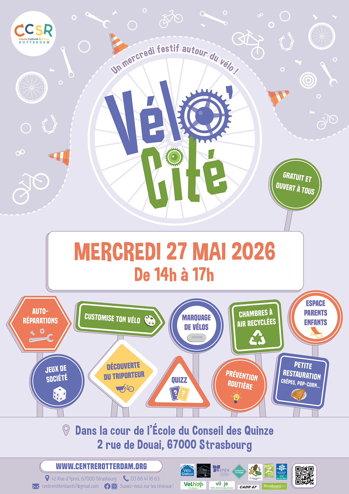 Vélo Cité, c’est la journée festive dédiée aux vélos du Centre Rotterdam, idéale pour se remettre en selle ! Un circuit semé de surprises se déroulera le mercredi 27 mai 2026, pour la douzième année consécutive, à l’École du Conseil des Quinze, 2 rue de Douai à Strasbourg. L’aventure débutera en matinée avec les enfants inscrits à de l’Accueil de Loisirs, puis se poursuivra de 14h à 17h pour tous, où petits et grands, familles et habitants pourront profiter librement et gratuitement du parcours.